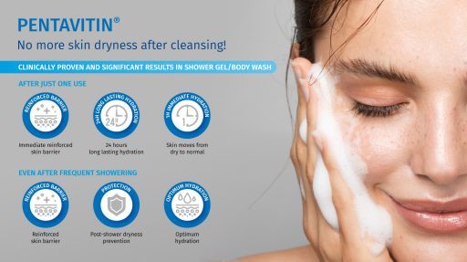 人體實驗證明,使用Pentavitin®葡聚糖保濕因子四週,能減少肌膚乾燥20%,改善脫屑角質,增加肌膚保護力。具備Ecocert, NATURE有機認證。