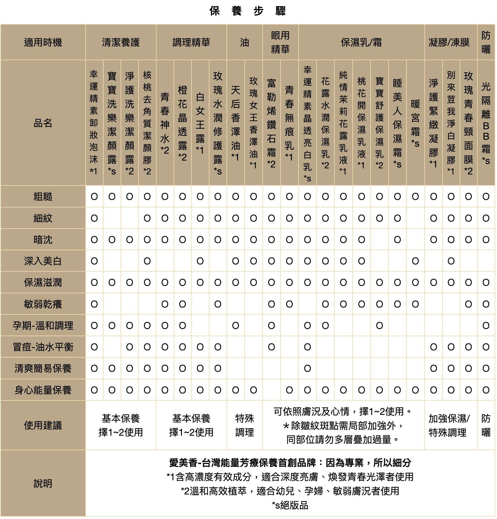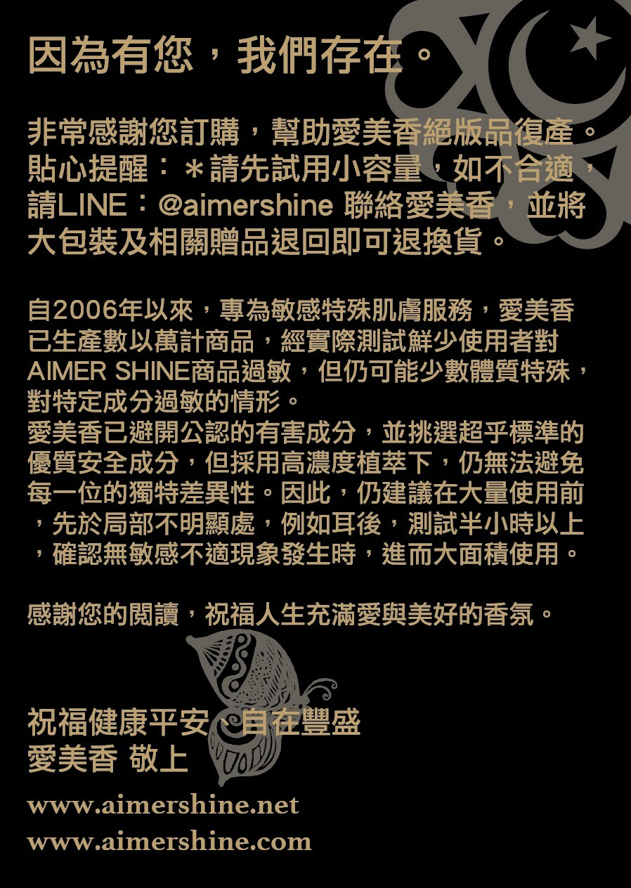 愛美香自2005年至今,遇過各式各樣奇特肌膚顧客,因此也更為謹慎。如果您從未使用過愛美香的商品,推薦您從最簡單基本的保養開始試用。愛美香關心您的健康與能量,也在乎整體效益,希望您不會覺得愛美香太囉唆,明明您很想一次就買很多,還勸退您。真心建議您可以先讓肌膚恢復健康之後,再回購其他商品。