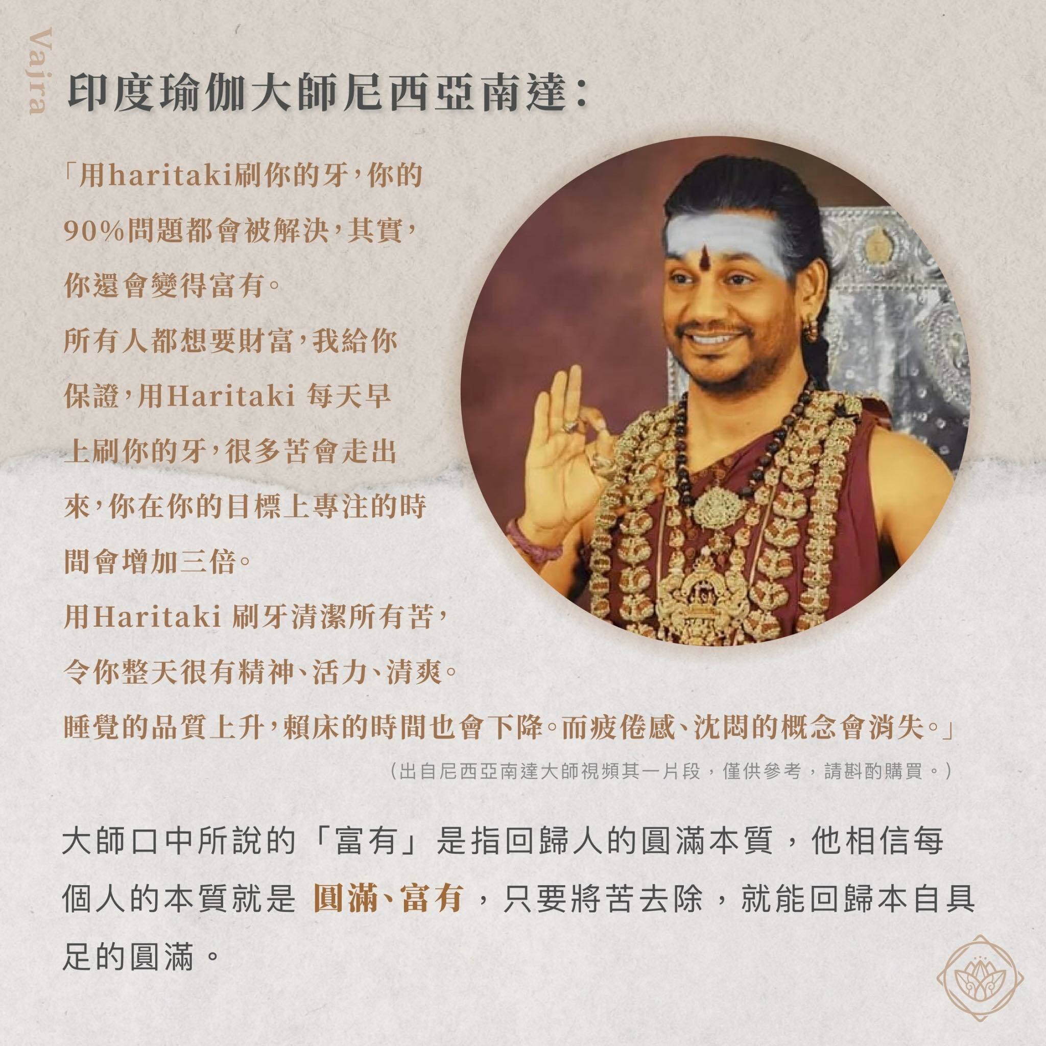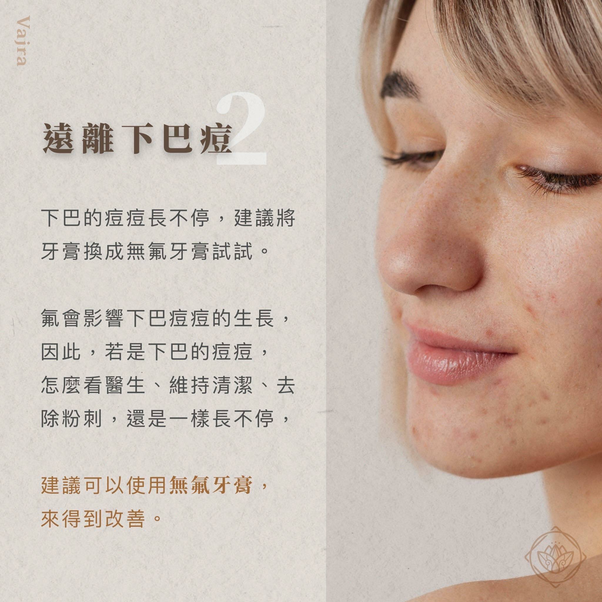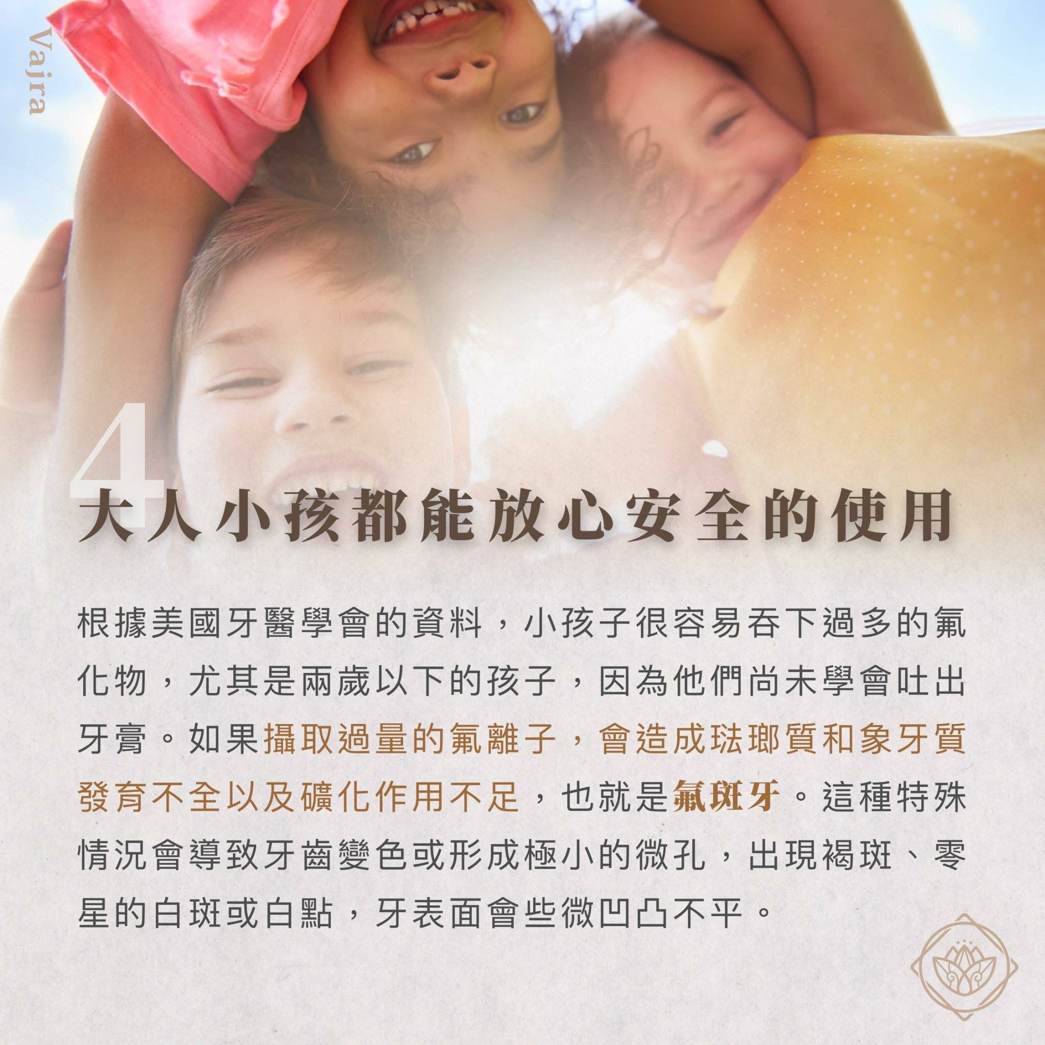 含精選藏青果訶子Haritaki成分,不含氟牙膏,孕婦幼童亦可安心清潔,原料皆採用食品級成分,並採用安息香酸鈉食品防腐劑保存。