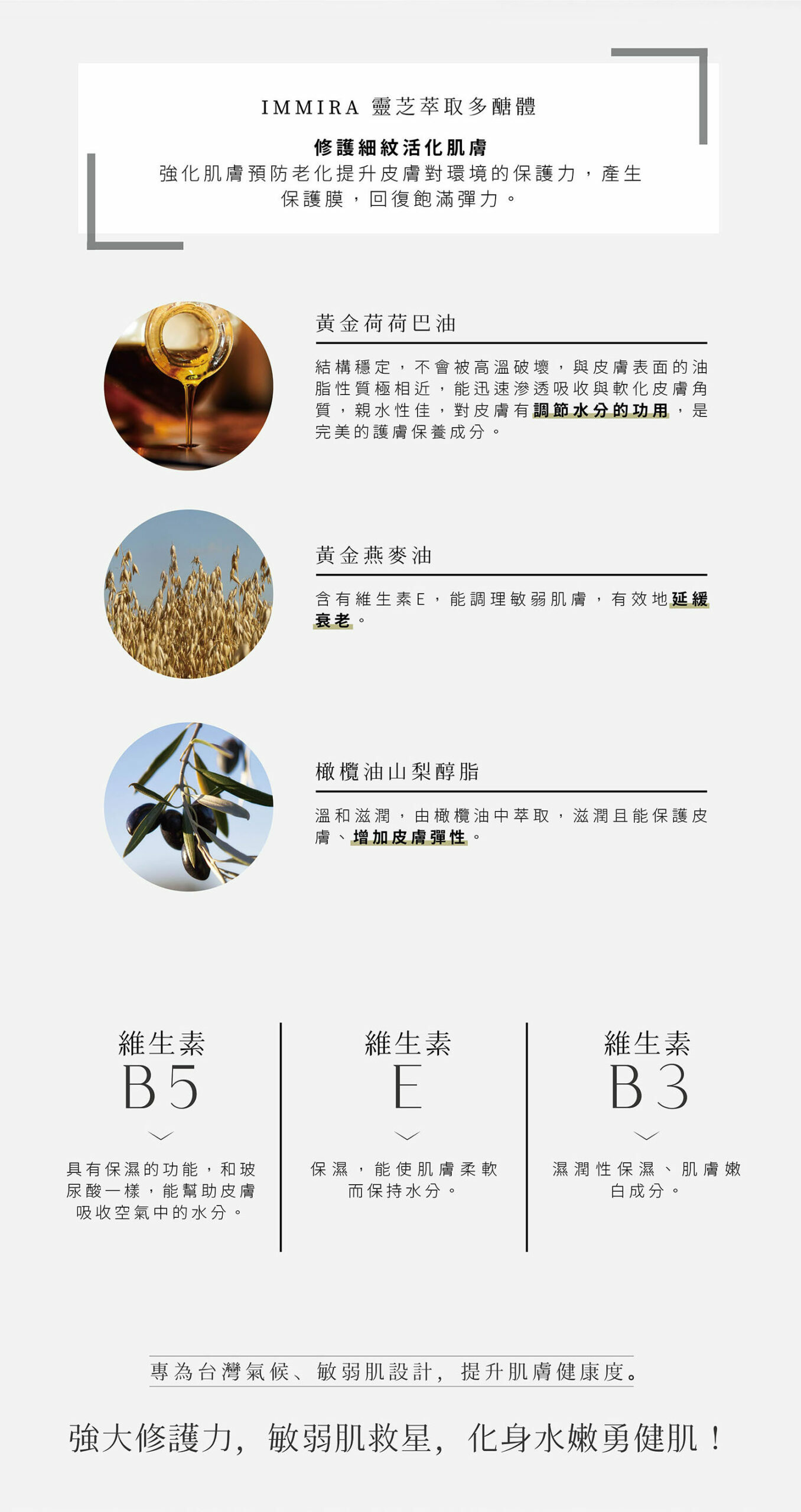 | 核心成分 | 諾貝爾獎得獎成分「富勒烯 (Fullerene)」及多種植萃修護成分。 | 「靈芝多醣體」及多種植萃修護保濕成分。 |